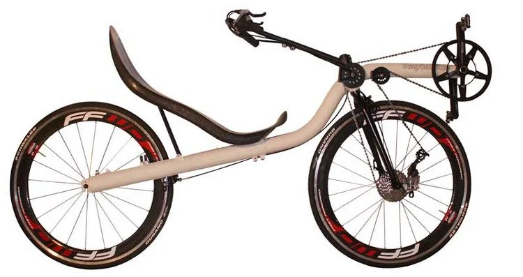 A recumbent bicycle with the novel feature that the frame size is adjusted in between the wheels. This means that when changing the size of the bike, the geometry changes accordingly to suit the rider.